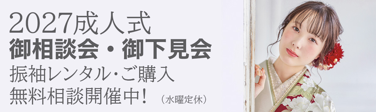 ただいま「2027年 振袖レンタル・ご購入 無料相談」を開催中。新作多数展示しております。