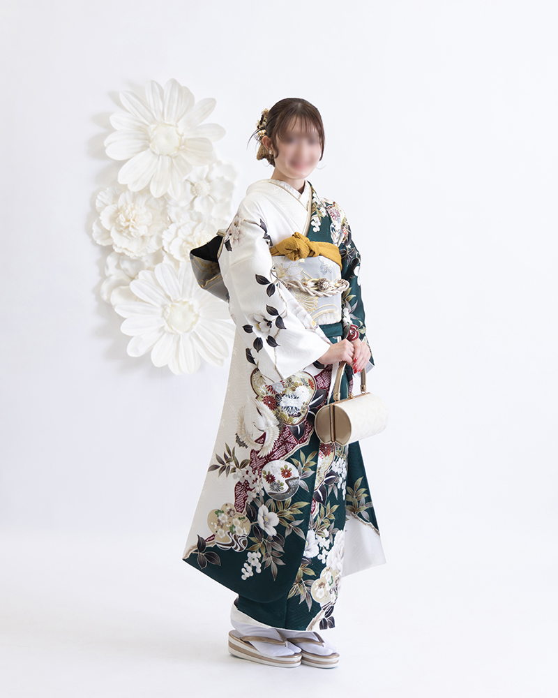 この振袖を見た瞬間、「これがいい!」と直感で思いました。深い緑の色合いに鶴や花の柄がとても綺麗で、大人っぽさと華やかさのバランスがちょうどよく、成人式にぴったりだと感じました。最初はどんな振袖が自分に似合うのか分からず迷っていましたが、スタッフの方が丁寧に話を聞いてくれて、たくさん試着させてくださいました。帯や小物も一緒に考えてもらえて、全体のコーディネートがすごく気に入りました。